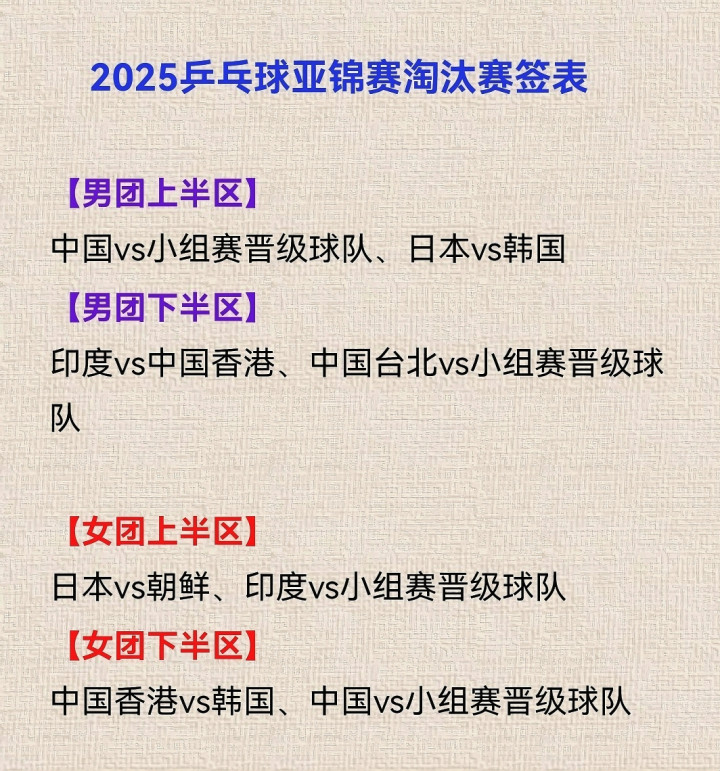 国乒男队签位比较理想,第一轮对阵小组赛晋级球队,正好可以用来养出状态。半决赛提前碰最强对手日本队或韩国队,取胜即可提前锁定冠军。